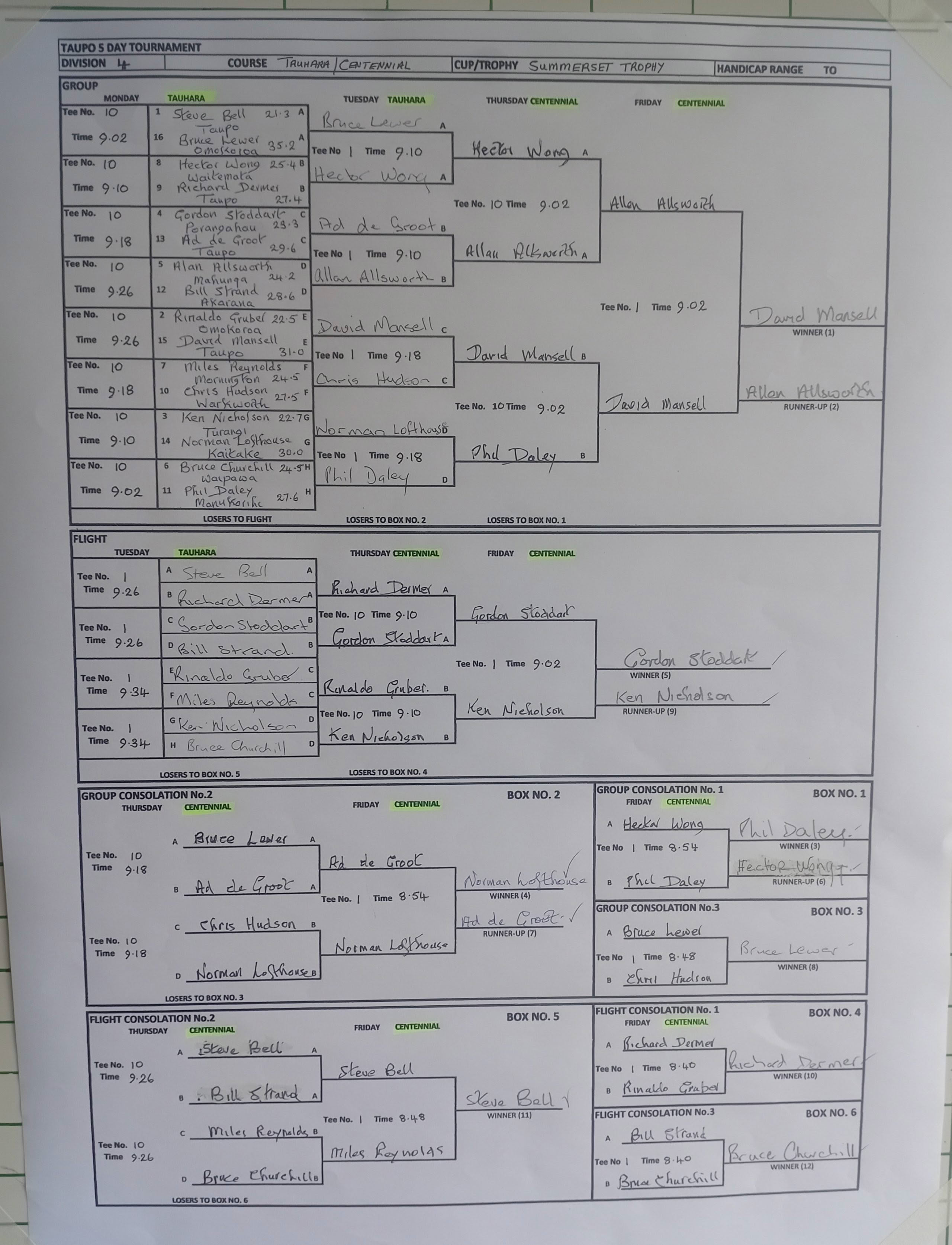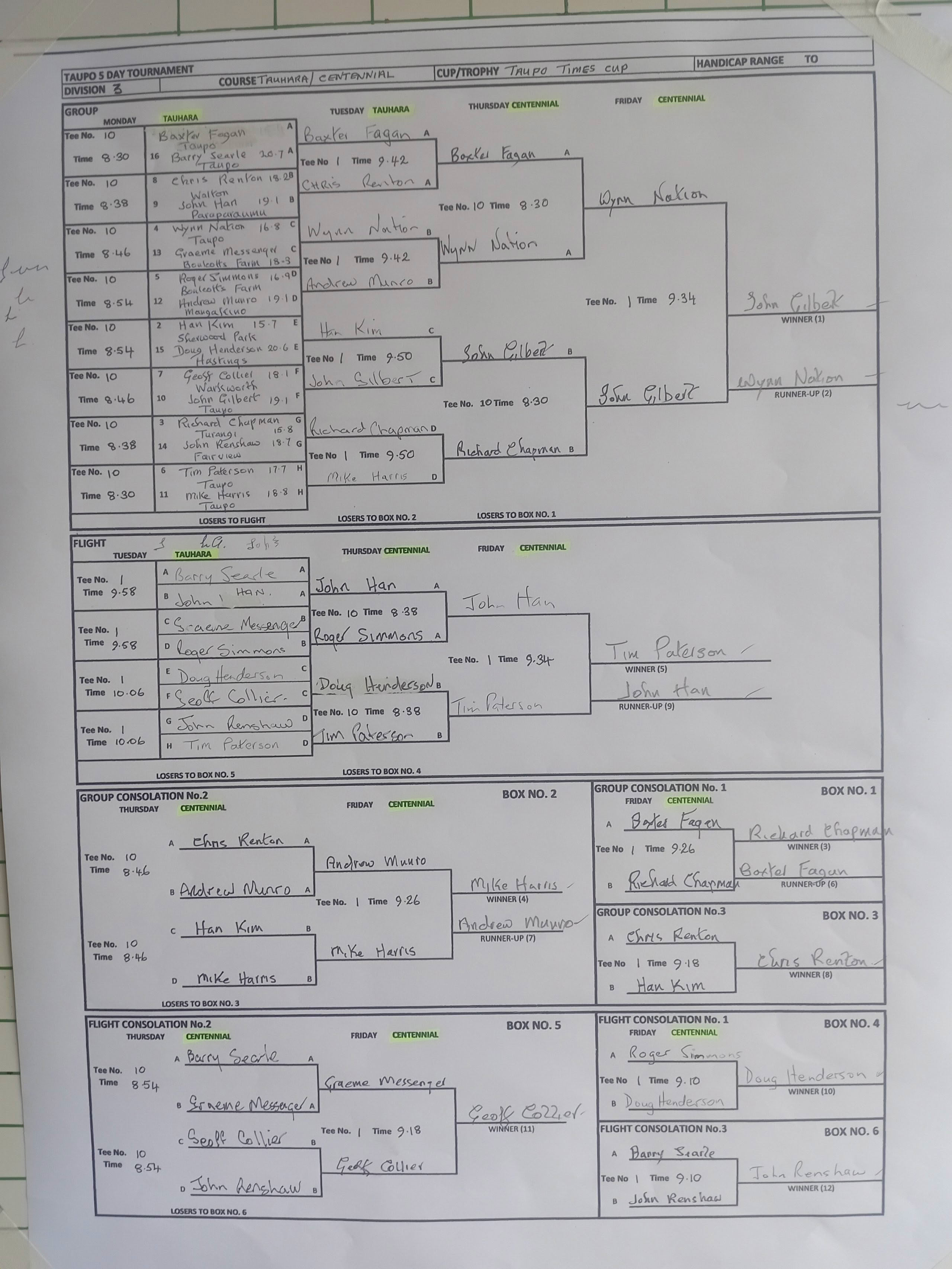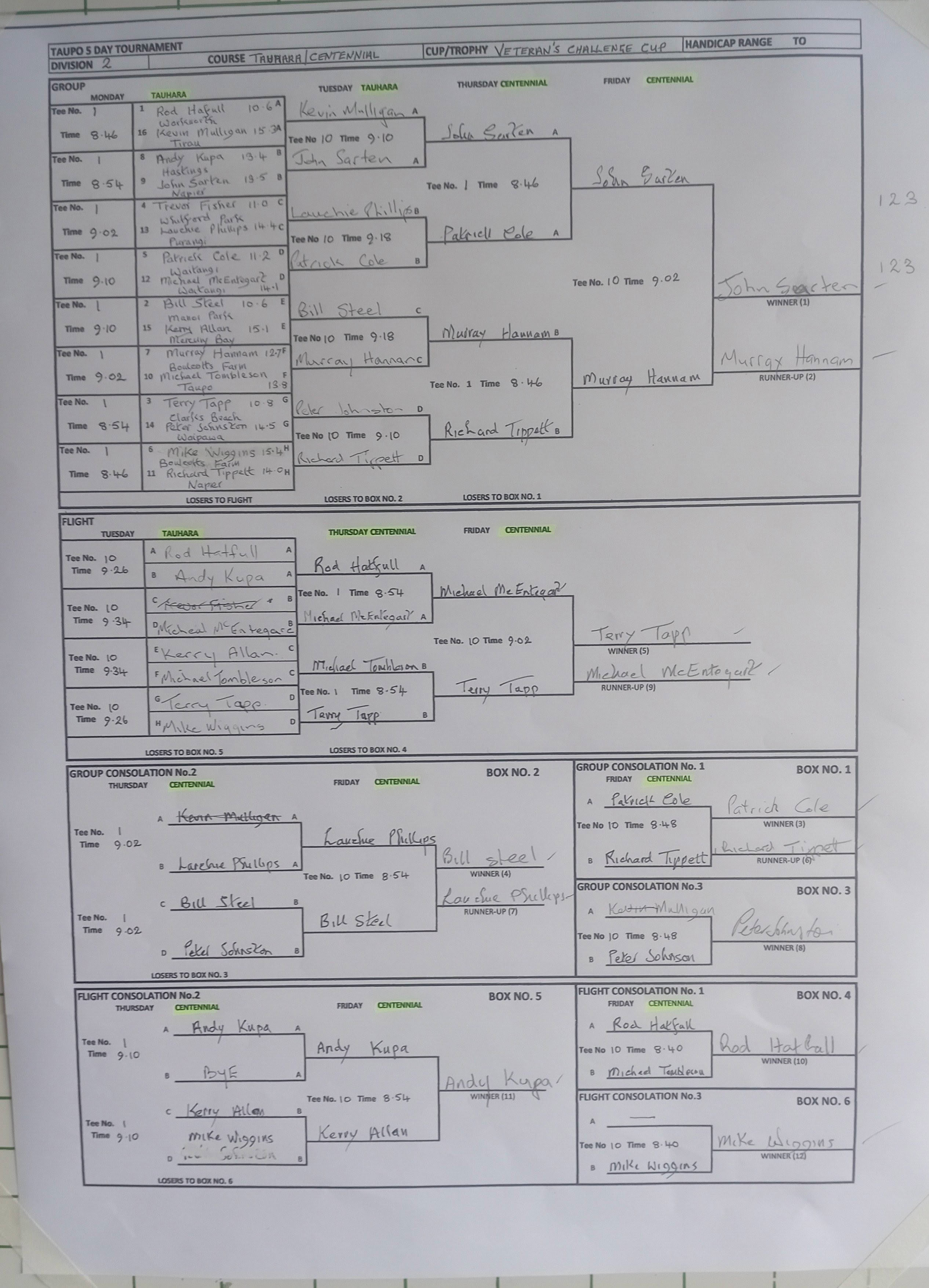 Group 3 (Consolation Cup) Winner: Geoff Robinson (Te Puke), Runner Up: Charles Brown (Tapora), Flight 1 Winner: Ian Hayes (Rotorua), Flight 2 Winner: Robert Giles (Rangitikei), Flight 3 Winner: Ole Iversen (Mangawhai)