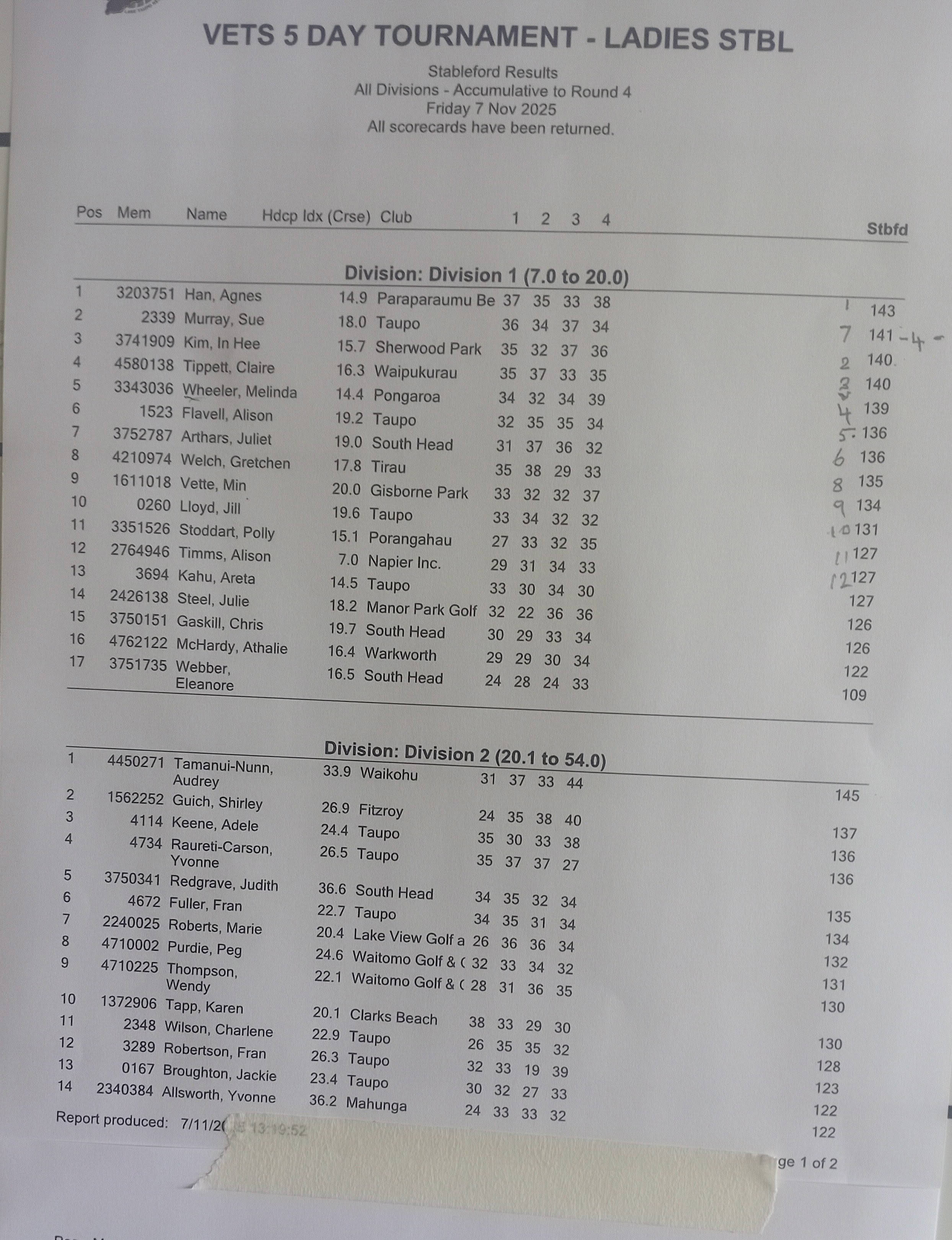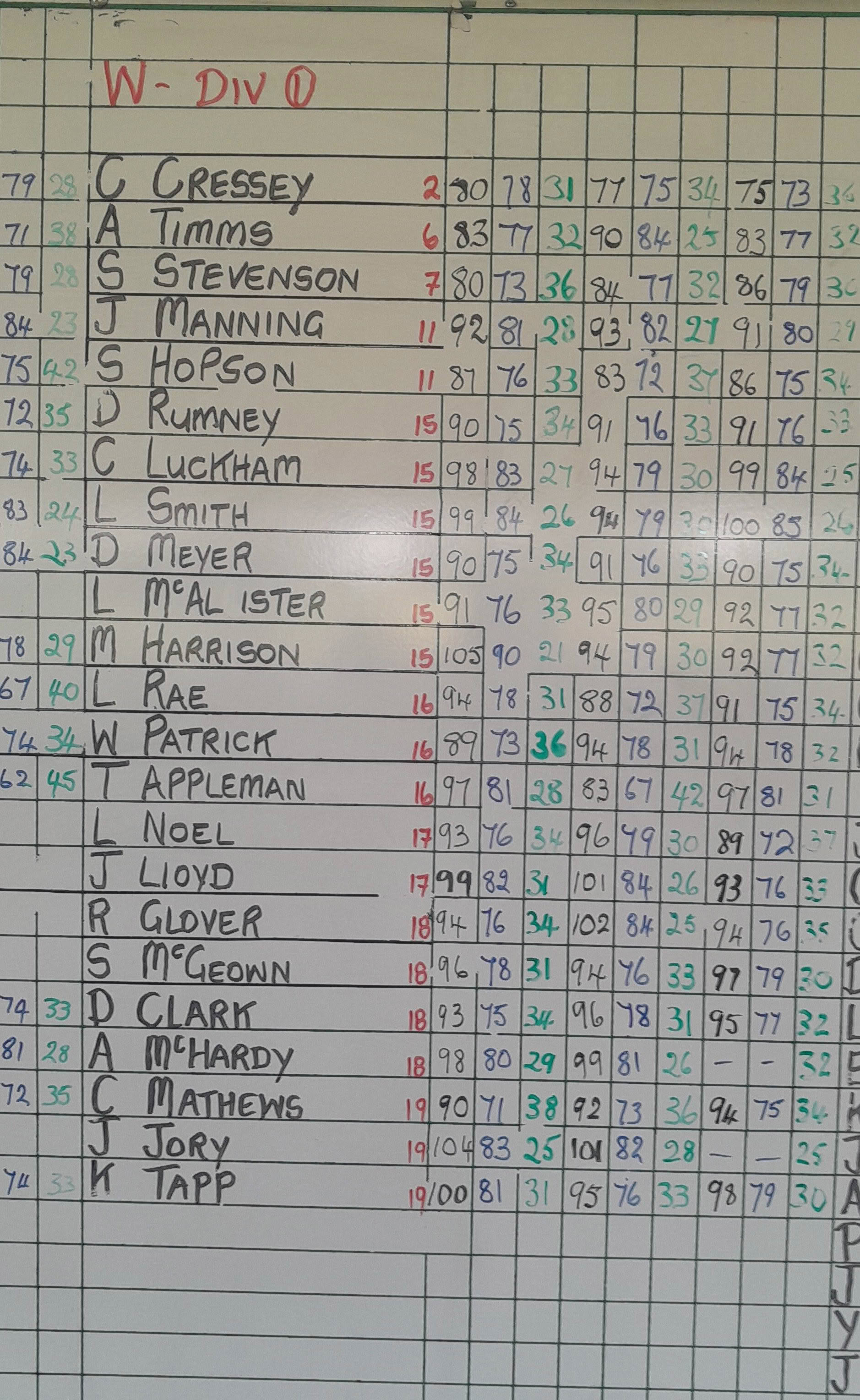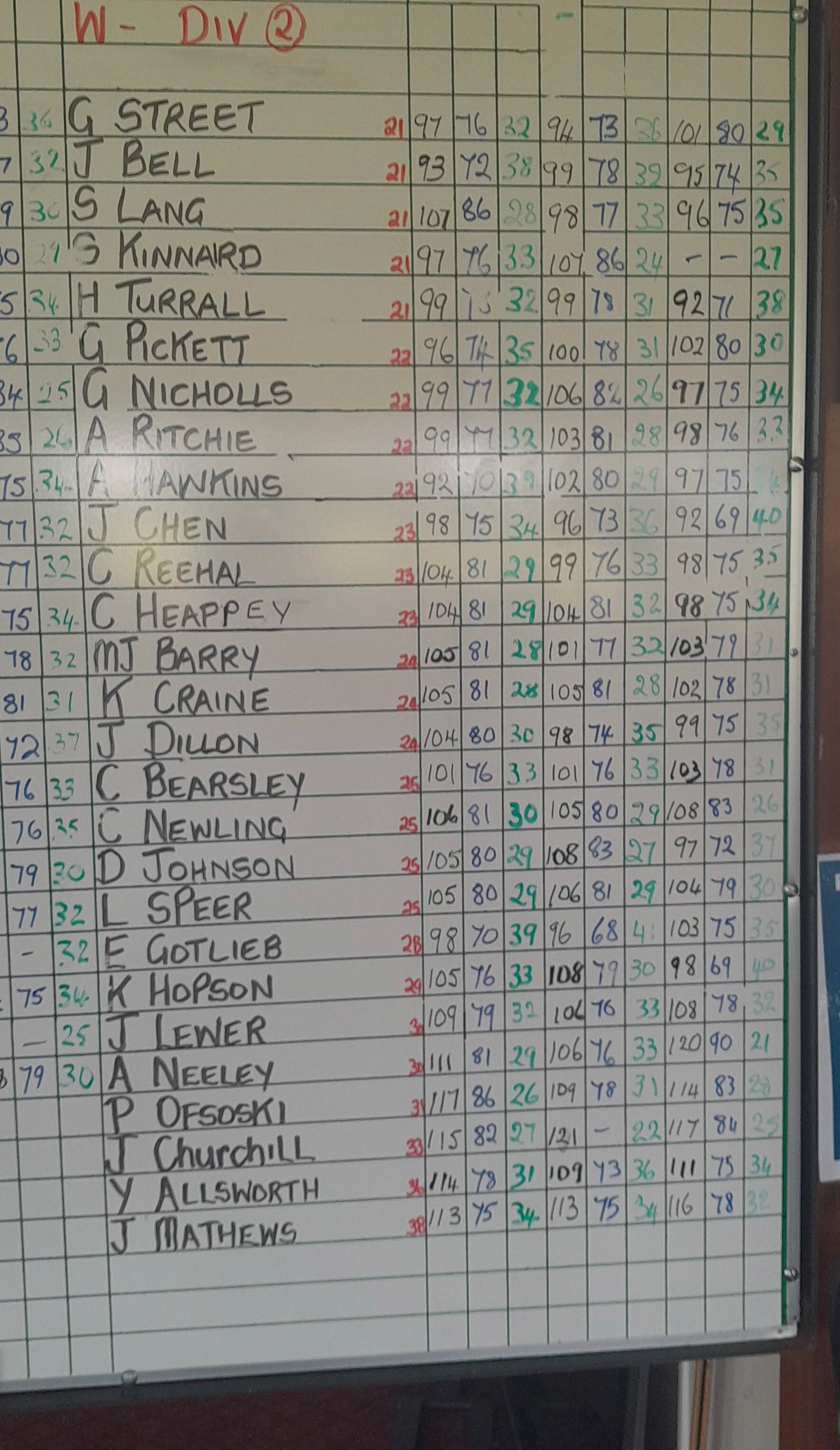 Women: Div 1 Gross: Kim Beale 169 Stableford: Im Hee Kim 70 Women: Div 2 Gross: Raewyn Dewe 206 Stableford: Wendy Guy 69