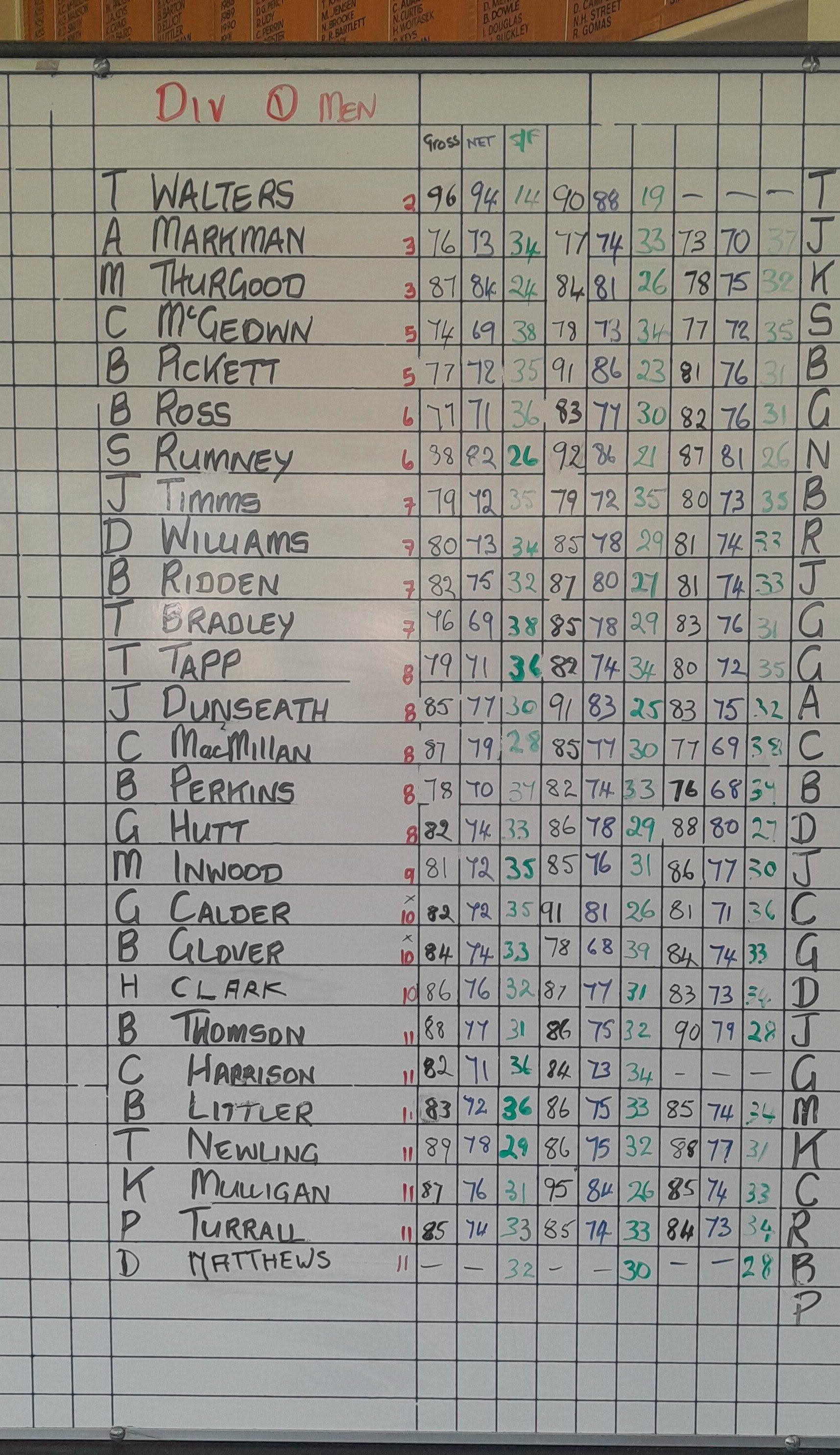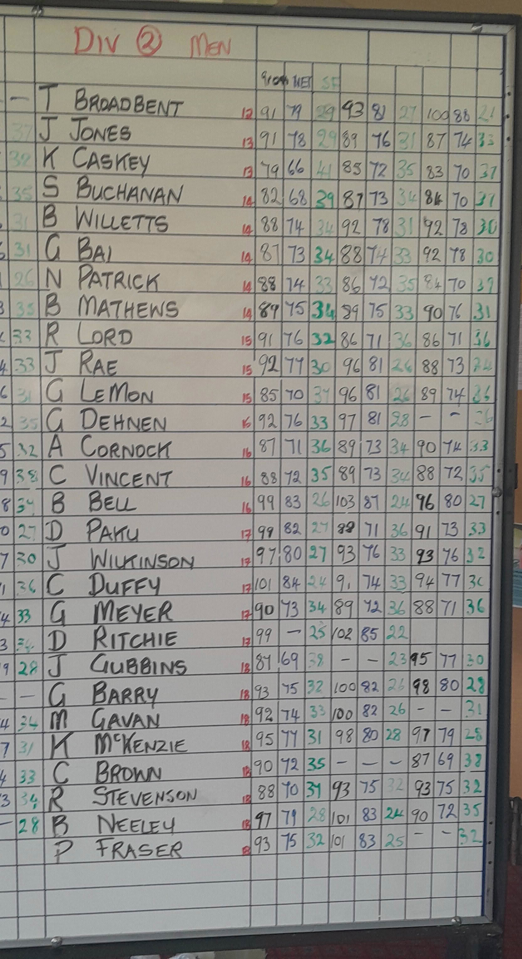 Men: Div 1 Gross: Alex MacDonald 157 Stableford: John Griffin 72 Men: Div 2 Gross: Barry Mathews 171 Stableford: Lawrie Fawcitt 72 Men: Div 3 Gross: Jonathon Moala 176 Stableford: Glenn Hunter 68